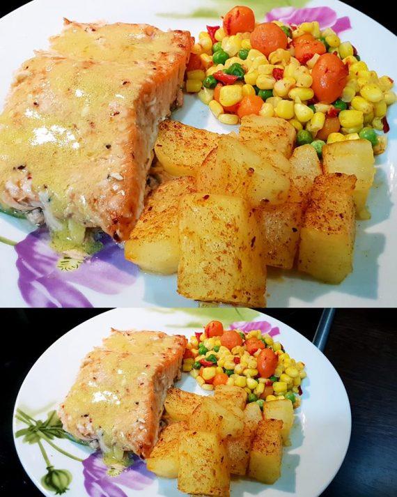 4-5 φιλέτα σολωμού 1 σακ. Σαλάτα καλαμποκιού 4-5 πατάτες Ελαιόλαδο Μουστάρδα Λεμόνι Μπουκοβο γλυκό Πάπρικα καπνιστή Πάπρικα γλυκιά Αλατι