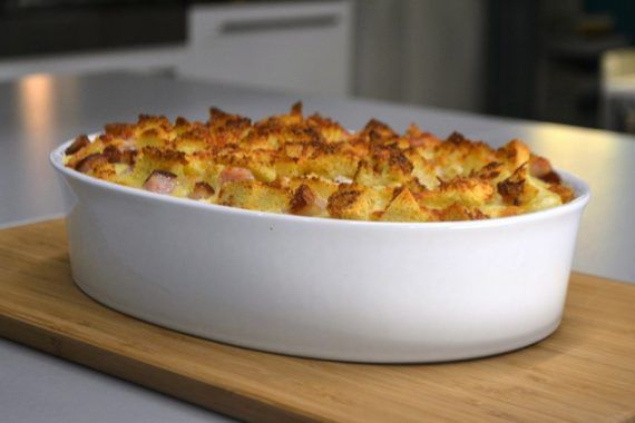 Κόβετε το ψωμί σε λεπτές φέτες και αφαιρείτε την κόρα. Στρώνετε ένα πυρίμαχο σκεύος με ένα στρώμα από φέτες ψωμιού και κόβετε τις υπόλοιπες φέτες σε κυβάκια.