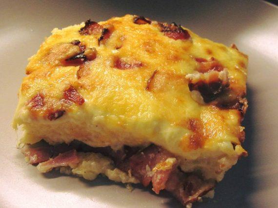 Σε ενα πυρεξ τοποθετησα φετες απο ψωμι και καλυψα ολο τον πατο του πυρεξ Σε ενα μπολ ειχα χτυπησει ελαφρα τα 2 αυγα, εριξα μεσα την κουπα με το γαλα, και τις κρεμες γαλακτος,ανακατεψα καλα και με αυτο εβρεξα με ενα κουταλι τις φετες του τοστ, ψιλοεκοψα κομματια το μπεικον και το τσιγαρισα λιγο, το εριξα επανω στο ψωμι,ετριψα και τις βρασμενες πατατες με τον τριφτη απο πανω,προσθεσα αρκετο τυρι γκουντα και λιγο απο το σκληρο Δανιας Τοποθετησα και τις αλλες φετες ψωμιου απο πανω τις εβρεξα και αυτες με το υγρο μειγμα, εριξα τα υπολοιπα τυρια και μερικα κομματια απο το μπεικον,και τελος εριξα ολο το υγρο μειγμα απο πανω να παει παντου….εψησα σε προθερμασμενο φουρνο για 45 λεπτα μεχρι να ροδισει και να γινει το φαγητο. Φουσκωνει παρα πολυ!!