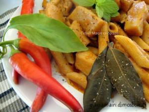 1 πακέτο πένες 2 μεγάλα κρεμμύδια χοντροκομμένα 1 ποτήρι ντοματοπολτός 2 φύλλα δάφνη 5-6 κόκκους μπαχάρι 1 σφηνάκι ξίδι η’ κρασί ελαιόλαδο αλατι πιπέρι