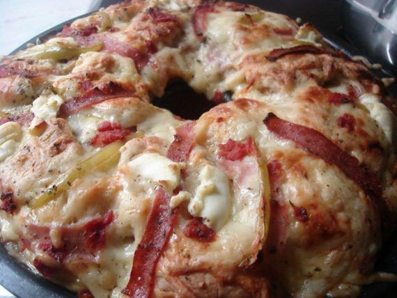 Δυαλυουμε τη μαγια στο χλιαρο γαλα και το προσθετουμε στα υπολοιπα υλικα. Ζυμωνουμε καλα.Αφηνουμε τη ζυμη μια ωρα να φουσκωσειΟταν φουσκώσει ανοίγουμε ένα μεγάλο φυλλο και κοβουμε τη ζυμη με ενα μαχαιρι σε τετραγωνακια(περιπου στο μεγεθος απο 1/2 σπιρτοκουτο) Λαδωνουμε καλα μια φορμα για κεικ και βαζουμε λιγα απ τα ζυμαρακια μας,προσθετουμε κασερι τριμμενο,ζαμπον,μανιταρια,πιπερια,με ενα κουταλι ριχνουμε λιγη σαλτσα εδω και εκει και πασπαλιζουμε με ριγανη!!!!Επαναλαμβανουμε το ιδιο αλλες τρεις φορες!