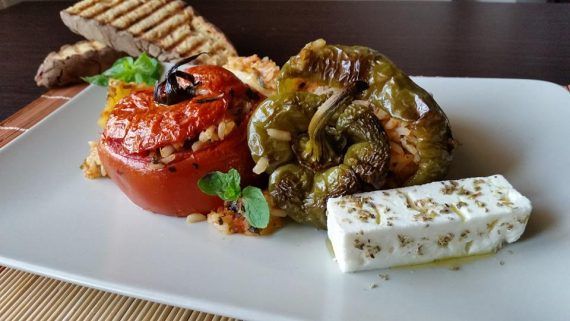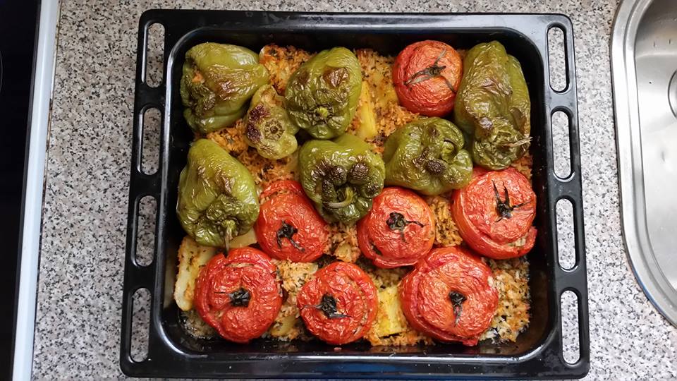 Σήμερα το μενού είχε γεμιστά ορφανά! Κλασική συνταγή για γεμιστά(χωρίς κουκουνάρι-σταφίδα) με τη διαφορά ότι μέσα στη γέμιση έτριψα ένα μεγάλο καρότο,ένα κολοκύθι (που λείπει από τη φώτο),έβαλα μισό ματσάκι μαϊντανό,μισό ματσάκι δυόσμο,και αντί για ρύζι Καρολίνα έβαλα μακρύκοκκο ρύζι(parboiled). Πριν γεμίσω τις τομάτες τις πασπάλισα με λίγο αλάτι και ζάχαρη και τις άφησα ανάποδα να φύγουν τα πολλά υγρά. Για τη γέμιση ενώ πολλοί βάζουν μια κουταλιά της σούπας ρύζι για κάθε γεμιστό εγώ έβαλα 4-5 κουταλιές επιπλέον σε όλο το μείγμα και όση γέμιση περίσσεψε την έριξα πάνω από τις πατάτες ανάμεσα στα γεμιστά. *Όταν τελειώσουμε με το γέμισμα μπορούμε να πασπαλίσουμε τα γεμιστά εκτός από το αλατάκι και τη ζάχαρη(στις τομάτες) και με λίγη φρυγανιά! Στον δικό μου φούρνο χρειάστηκε να ψήσω για 1 ώρα και 40 λεπτά στους 180 βαθμούς με αντιστάσεις.