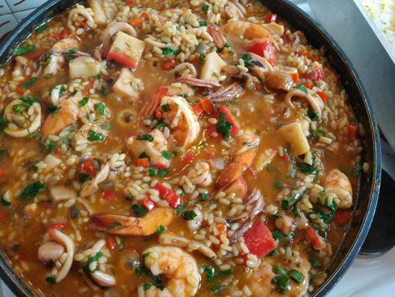 Σοτάρω ξεχωριστά σε λάδι μαζί με μια κουταλιά βούτυρο αρωματισμένο με γλυκιά πάπρικα και σαφράν, μισό κιλό γαρίδες, μισό κιλό καλαμαράκια φρέσκα και ένα πακέτο κατεψυγμένο μιξ θαλασσινών. Τα βγάζω σε ένα σκεύος κι αλατίζω από πάνω. Στο ίδιο λάδι σοτάρω ένα μεγάλο ψιλοκομμένο κρεμμύδι και τρεις σκελίδες σκόρδο. Όταν γυαλίσουν προσθέτω δύο ψιλοκομμένες πιπεριές Φλώρινης και δύο τριμμένες κόκκινες ντομάτες. Μετά από 5 λεπτά βάζω μαλακό κίτρινο ρύζι,σταδιακά το ζωμό από τα κεφάλια και το κέλυφος των ουρών της γαρίδας, αλατοπίπερο, λίγο κρόκο Κοζάνης ακόμη και σιγοβράζω για δέκα λεπτά. Ξαναβάζω τα θαλασσινά μου, ένα φύλλο δάφνης και σε 5 ακόμη λεπτά πριν το σβήσω βάζω μαϊντανό και άνηθο. Έγινε πολύ γευστικό, δεμένο κι αρωματικό χωρίς να χρησιμοποιήσω καθόλου κρασί ή έξτρα βούτυρο στο τέλος.