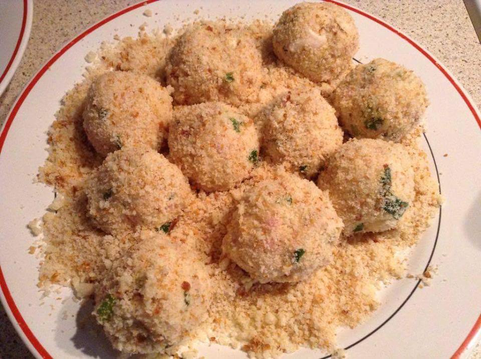Εκτέλεση Βράζουμε ένα στήθος κοτόπουλο και το μαδάμε σε ένα μπολ. Προσθέτουμε 2 αυγά 2 κρεμμυδάκια φρέσκα 2 φέτες ψιλοκομμένη παριζα ή ότι αλλαντικο μας αρέσει 30γρ αλεύρι 170γρ τυρί τριμμένο 1/2 κουταλάκι πάπρικα λίγο πιπέρι μία σκελιδα σκόρδο λιωμένη στο γουδί με μισό κουταλάκι αλάτι και προαιρετικά μια κουταλιά BBQ SAUCE ή κρέμα μπαλσαμικο. Ανακατεύουμε, πλαθουμε μπαλάκια, τα τυλίγουμε σε τριμα ψωμιού η φρυγανιά και τηγανιζουμε μέχρι να ροδισουν!