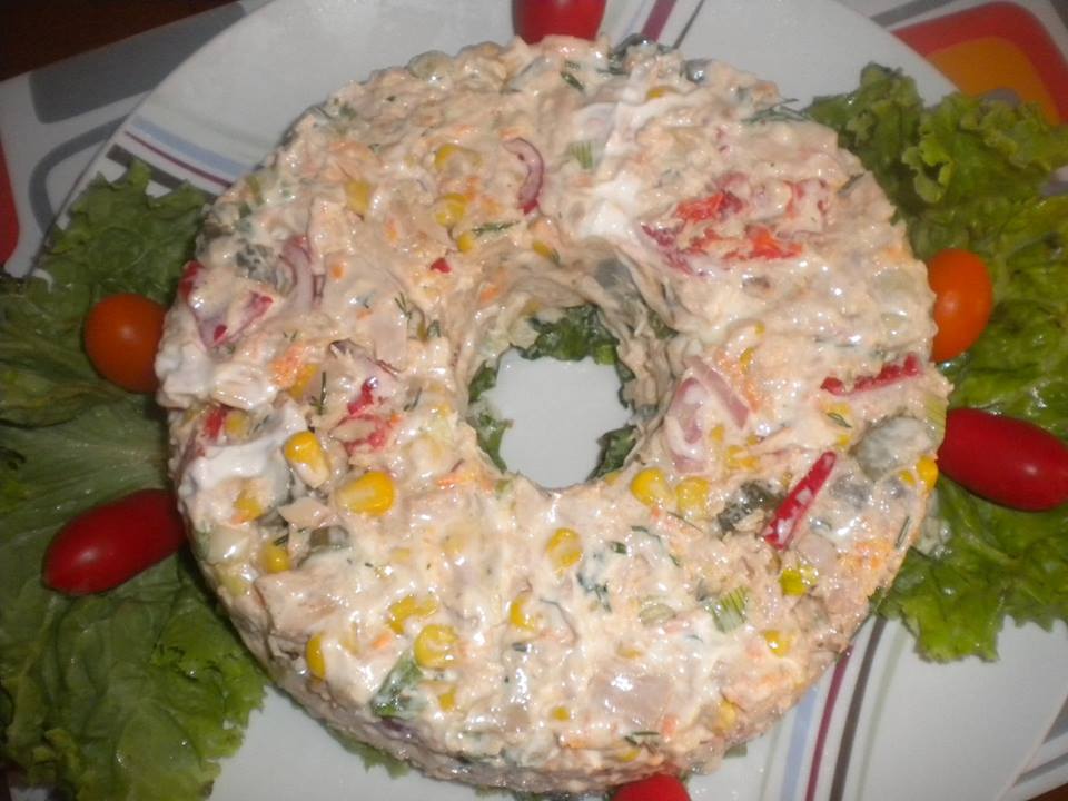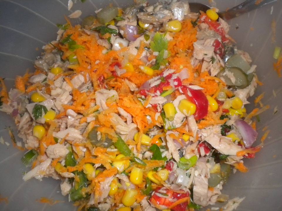 2 κονσέρβες τόνο Αλοννήσου σε νερό 200 γρ . καλαμπόκι 5-6 αγγουράκια τουρσί κομμένα σε λεπτές ροδέλες (πίκλες), 1 μικρό κρεμμυδάκι ξερό πολύ ψιλοκομμένο, 4-5 φρέσκα κρεμμυδάκια ψιλοκομμένα, άνηθο ψιλοκομμένο, μαϊντανό ψιλοκομμένο, 2-3 αντζούγιες ψιλοκομμένες, 1 πιπεριά κόκκινη ψιλοκομμένη, ½ πιπεριά πράσινη ψιλοκομμένη, 1 καρότο τριμμένο