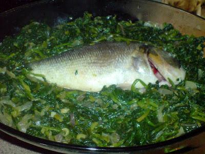 ΥΛΙΚΑ 1 τσιπούρα ,η,σφυρίδα,η συναγρίδα.κ.α 1 κιλό σπανάκι φρέσκο 2 κρεμμυδάκια φρέσκα κομμένα σε ροδέλες 2 κρεμμύδια ξερά κομμένα σε ροδέλες 5 ντομάτες΄φρέσκες ώριμες ψιλοκομμένες 2 φύλλα δάφνης 1\2 φλιτζάνι του τσαγιού ελαιόλαδο αλάτι -πιπέρι