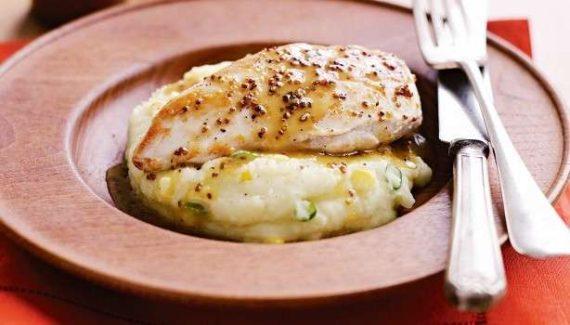 Κοτόπουλο, στήθος φιλέτο, με σάλτσα μουστάρδας μελιού και πουρέ με καλαμπόκι και φρέσκα κρεμμυδάκια. Μια εύκολη συνταγή για ένα πλήρες, νόστιμο και εύκολο γεύμα ή δείπνο για όλη την οικογένεια.