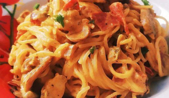 Μπορούμε να βάλουμε πένες, φιογκάκια, σπαγκέτι ή ό,τι άλλο ζυμαρικό μας αρέσει. Η σάλτσα μας είναι φτιαγμένη από κρέμα γάλακτος, με κοτόπουλο, μπέικον, πράσινη πιπεριά και πιπεριά Φλωρίνης, μανιτάρια και διάφορα μπαχαρικά της επιλογής μας.