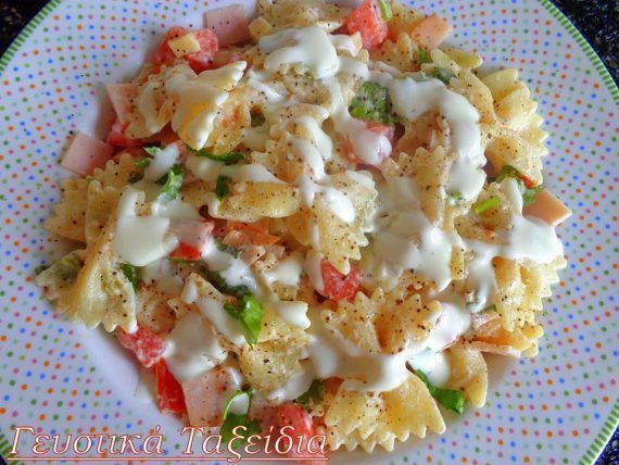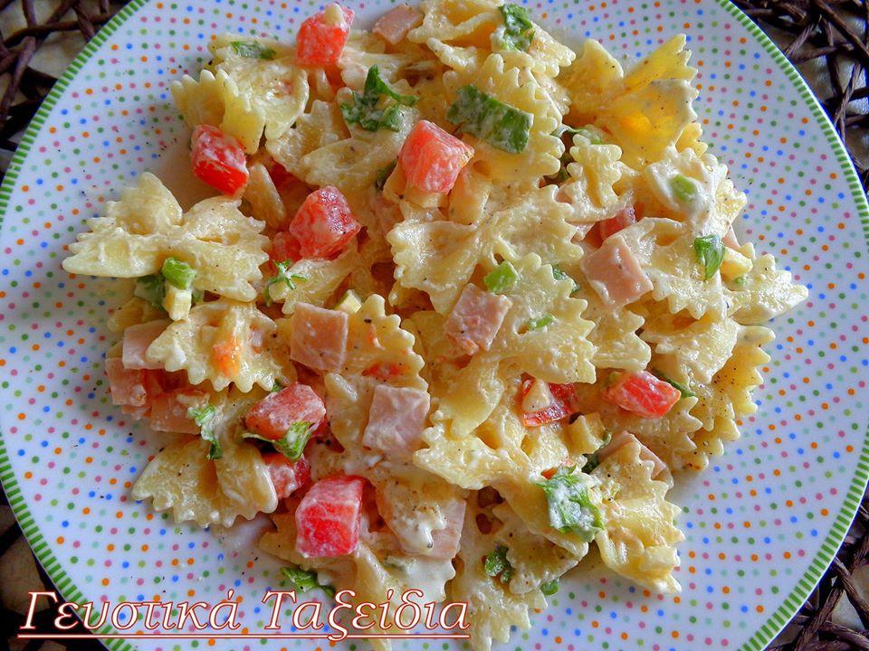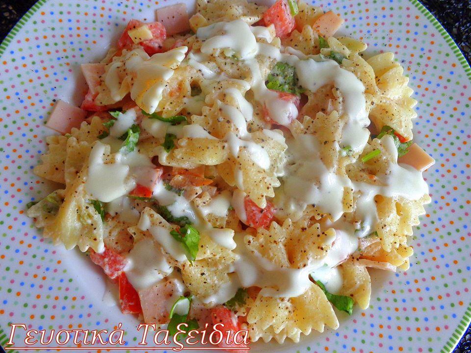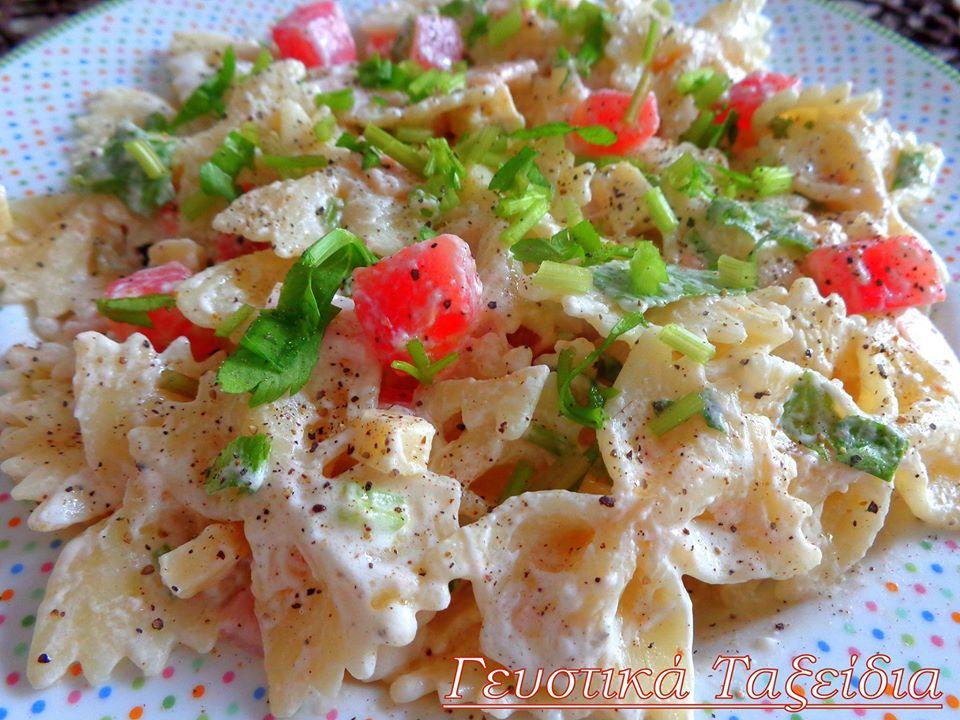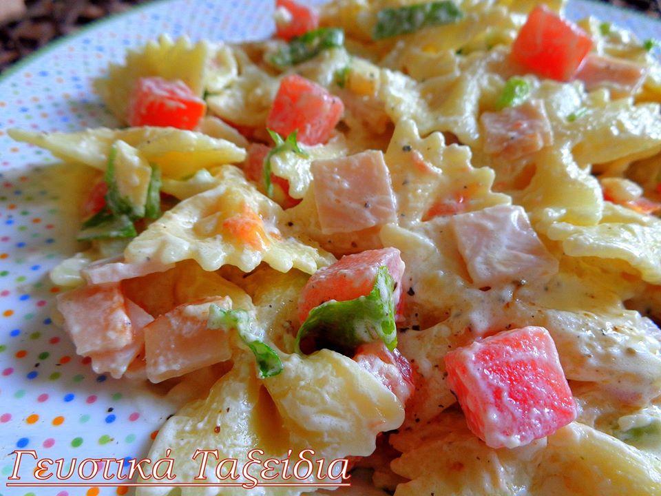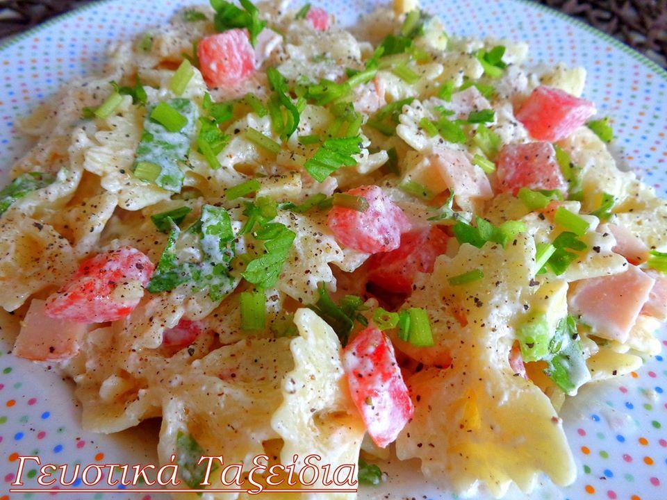 ΥΛΙΚΑ ΓΙΑ 5-6 ΑΤΟΜΑ: 250 γρ. φαρφάλες 4 κοτσανάκια σέλινο 6 φέτες ζαμπόν γαλοπούλας 150 γρ. γραβιέρα Κρήτης 1 ντομάτα ξεφλουδισμένη καί ξεσποριασμένη 100 γρ. τυρί Φιλαδέλφεια 2 κουτ. σούπας ελαιόλαδο 1 κουτ. σούπας χυμό λεμονιού 50 γρ. γιαούρτι στραγγιστό Πιπέρι φρεσκοτριμμένο