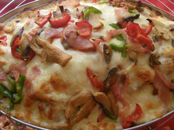 Επίσης προσθέτουμε τα μανιτάρια χωρίς τα ζουμιά της κονσέρβας, κομμένα σε ροδέλες αν είναι φρέσκα, το ζαμπόν κομμένο σε μικρότερο κομμάτια και την τριμμένη μοτσαρέλα. Ψήνουμε στους 200 βαθμούς Κελσίου, μέχρι να λιώσει η μοτσαρέλα και να ροδίσει το φαγητό.
