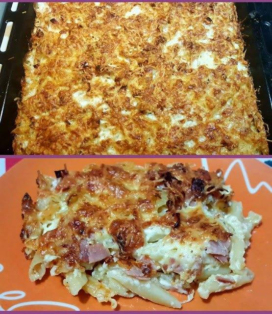 1 πακ. Πέννες 200 gr ρεγκάτο τριμμένο 200 gr ένταμ τριμμένο Κεφαλοτύρι τριμμένο (περίπου 1-2 χούφτες) 2 κρέμες γάλακτος μεγάλες 10 φέτες ζαμπόν σε κομματάκια 6 φέτες μπέικον σε κομματάκια