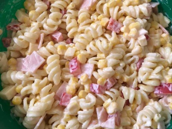 Βράζουμε τα μακαρόνια όση ώρα λέει η συσκευασία. Βράζουμε το καλαμπόκι 10-12 λεπτά. Αφού βράσουν τα σουρώνουμε και τα αφήνουμε να κρυώσουν ή τα βάζουμε σε κρύο νερό και ξανασουρώνουμε πολύ καλά.