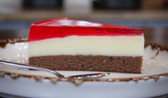 Μαμαδίστικο δροσερό γλυκό ψυγείου με ζελέ, σοκολατένιο παντεσπάνι, κρέμα βανίλια και ζελέ φράουλα!