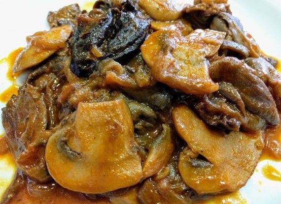 Ανάλογα με τα άτομα βάζετε και τις ανάλογες ποσότητες! Μανιτάρια δύο ειδών ή ότι έχετε 3 με 4 κρεμμύδια ξερά, 1 ποτήρι κόκκινο κρασί, σάλτσα ντομάτας, δαμάσκηνα χωρίς κουκούτσι , ελαιόλαδο, ξύλο κανέλας, 4-5 κόκκους μπαχάρι, 2-3 φύλλα δάφνης, αλάτι, μαύρο πιπέρι και λίγη ζάχαρη!