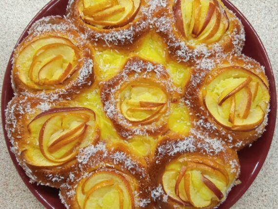 Γεμίζουμε κάθε βαθούλωμα με κρέμα και τοποθετούμε σε αυτά κυκλικά τις φέτες μήλου. Βάζουμε κρέμα και στα κενά που δημιουργούνται μεταξύ κεντρικού κομματιού και των υπολοίπων. Αλείφουμε την ζύμη με ελαφρώς χτυπημένο αυγό στο οποίο προσθέσαμε και ένα 1 κουταλάκι του γλυκού γάλα.