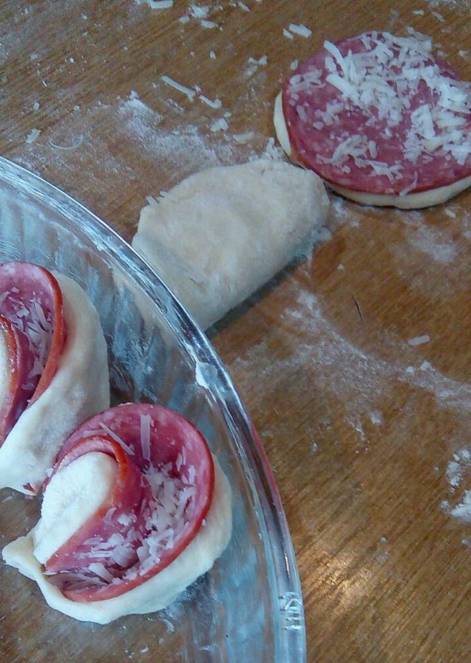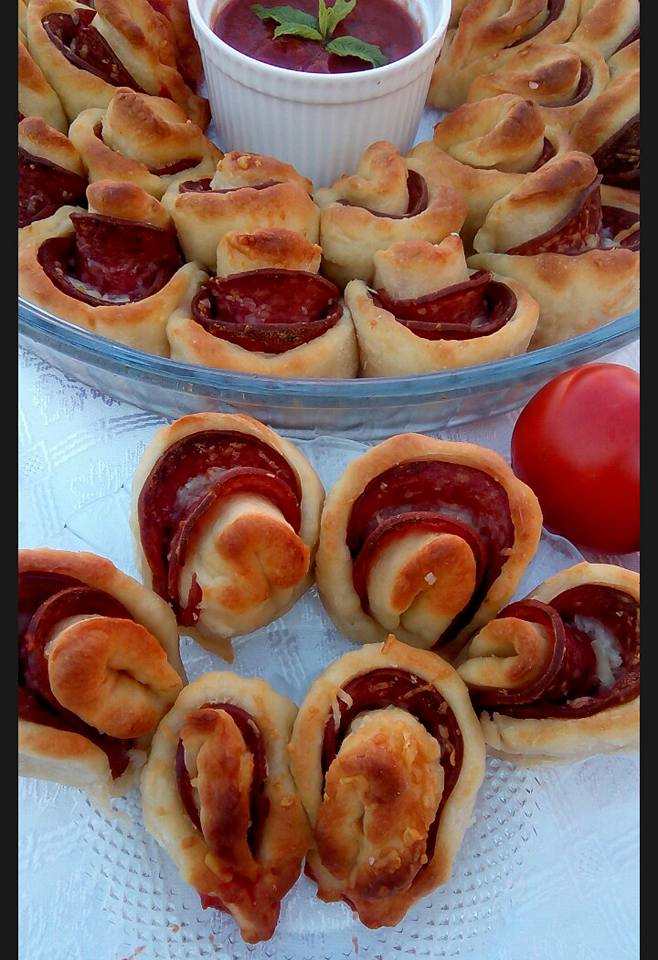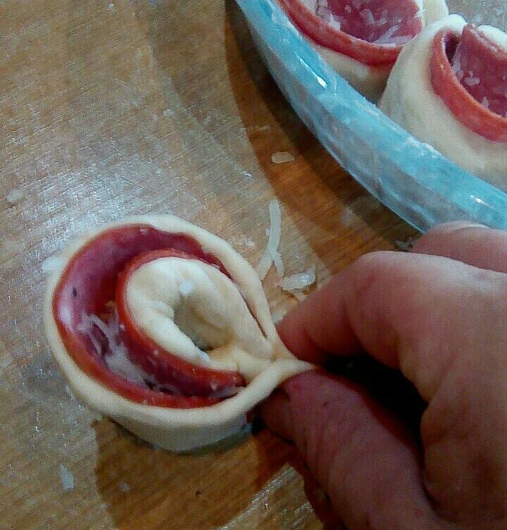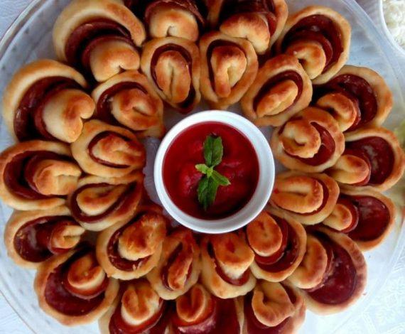 Στο χλιαρό γάλα διαλύουμε την μαγιά, προσθέτουμε το αλάτι,την ζάχαρη . Ρίχνουμε το λάδι το αυγό ανακατεύοντας με το χέρι και σιγά ,σιγά προσθέτουμε και το αλεύρι ζυμώνοντας μέχρι να έχουμε μια μαλακή ζύμη που να μην κολλάει στα δάχτυλα μας. Σκεπάζουμε καλά και αφήνουμε μισή ώρα να φουσκώσει. Περνούμε έπειτα μικρά κομμάτια από την ζύμη και τα ανοίγουμε με τον πλάστη μικρά φύλλα με πάχος ενός εκατοστού . Βάζουμε επάνω τα αλλαντικά και το διπλώνουμε ,έπειτα πιάνουμε τις δύο άκρες και τις κολλάμε κλείνοντας. Αραδιάζουμε σε πυρέξ βουτυρωμένο ομοιόμορφα κυκλικά γύρω γύρω . Ψήνουμε στους 200 βαθμούς μέχρι να ροδίσει το ζυμάρι και να ψηθεί καλά και από κάτω.
