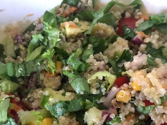 Τι να πούμε γι’ αυτήν την σαλάτα. Δεν είναι σαλάτα. Είναι πλήρες γεύμα. Μία δροσερή και καλοκαιρινή Μαρουλοσαλάτα με κινόα βρασμένο καλαμπόκι, κρεμμύδι, αγγούρι, ντοματίνια, μαϊντανό, καρότο, μαρούλι και σπιτικό ντρέσινγκ από μέλι, μπαλσάμικο με γεύση πορτοκαλιού, χυμό λεμονιού και ελαιόλαδο.
