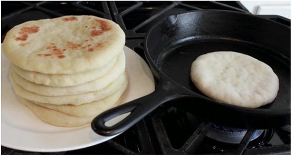 Μόλις η ζύμη είναι έτοιμη, κόψτε τη σε 8 κομμάτια και αρχίστε να τη ζυμώνετε ώστε να πάρει σχήμα. Καλύψτε τη αργότερα με ένα διηθητικό χαρτί και αφήστε τη για 30 λεπτά. Μετά από μισή ώρα, τεντώστε τη ζύμη με τον πλάστη για να σχηματίσετε 12 εκατοστών πίτες με πλάτος 5 mm. . Βάλτε σε ένα τηγάνι, λίγο ελαιόλαδο να ζεσταθεί και προσθέστε τις πίτες μία προς μία, και τηγανίστε τες για περίπου 2 λεπτά ανά πλευρά. Αν προτιμάτε το φούρνο, βάλτε τις πίτες σε ένα ταψί αλειμμένο με λάδι και ψήστε για 10 λεπτά στους 240 βαθμούς.