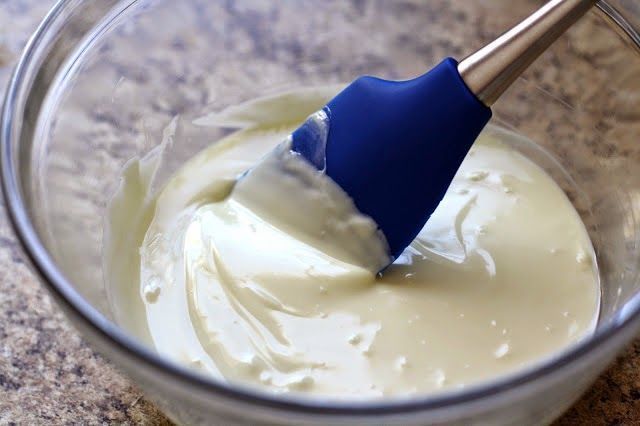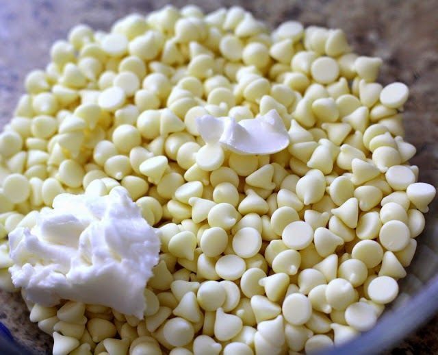 Βάζετε την λευκή σοκολάτα σε μπεν -μαρί μαζί με το βιτάμ και περιμένετε να λιώσει. Όσοι βαριέστε την διαδικασία στο μπεν-μαρι μπορείτε να βάλετε σε ένα γυάλινο μπολ τα υλικά και να το βάλετε στο φούρνο μικροκυμάτων για 1-2 λεπτά. Το μπεν-μαρι βέβαια είναι πιο υγιεινό.
