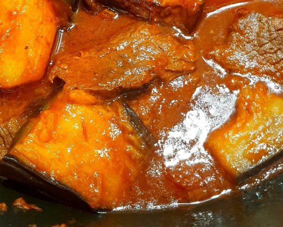 Σιγοβράζουμε το φαγητό μας για περίπου 1 ώρα. Στο μεταξύ περνάμε από τηγάνι τις πατάτες και τις μελιτζάνες, κομμένες σε κύβους και τίς προσθέτουμε και αυτές στο μοσχάρι. Προσθέτουμε τα ντοματίνια και μαγειρεύουμε μέχρι να χυλώσει η σάλτσα μας και να δέσει το φαγητό μας.
