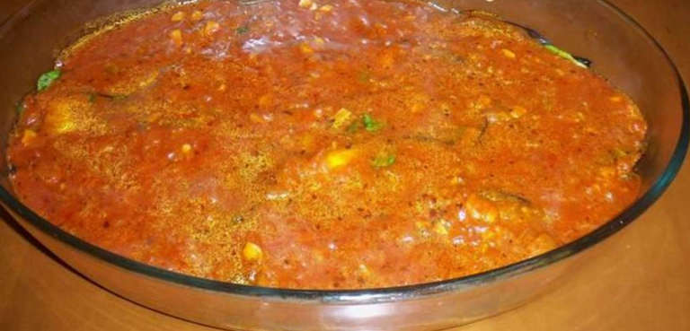 Από πάνω ραντίζουμε με λίγο ψιλοκομμένο βασιλικό και δυόσμο, περιχύνουμε με την σάλτσα και βάζουμε το πυρέξ στον φούρνο, στους 180 βαθμούς, για 10 λεπτά.