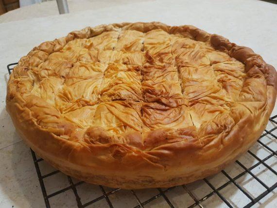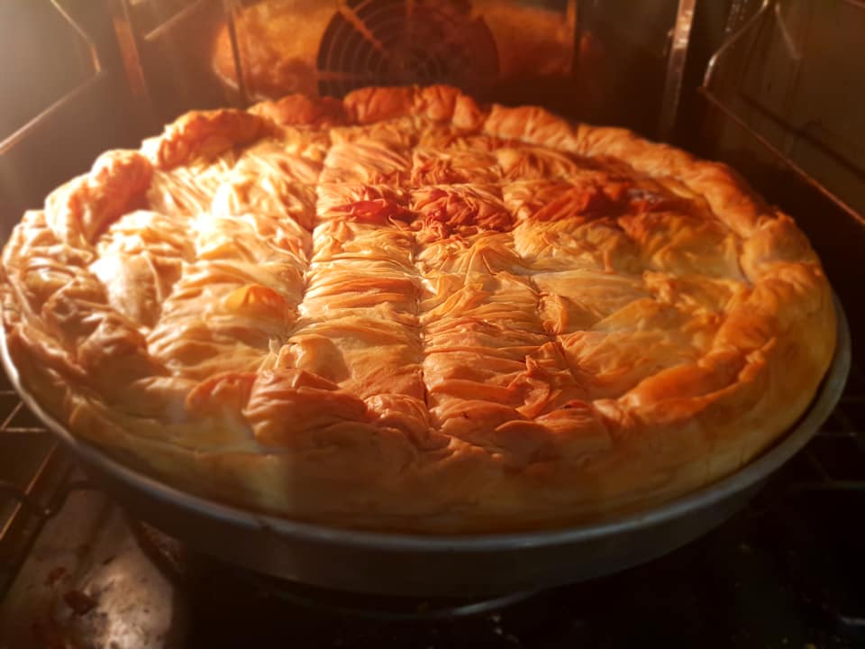 Ανοίγω 4 φύλλα , τα κόβω στη μέση και τα ψήνω ΕΝΑ ΕΝΑ με ελάχιστο λάδι στο ταψί! Ανοίγω ένα μεγάλο φύλλο κάτω στο ταψί και έξω από το ταψί ! Ανοίγω ένα φύλλο το κόβω σε λωρίδες και το τοποθετώ έξω από το ταψί για τον κόθρο! Ανοίγω ένα φύλλο το κόβω στη μέση και τα βάζω πάνω από το πρώτο! Τοποθετώ 3 προψημένα φύλλα ! Βάζω τη μισή γέμιση! Προσθέτω δύο προψημένα φύλλα! Βάζω την άλλη μισή γέμιση και βάζω 3 φύλλα προψημένα από πάνω ! Ανοίγω ένα φύλλο το κόβω στα δύο και τα βάζω πάνω από τα προψημένα ! Ανοίγω ένα μεγάλο και το τοποθετώ τελευταίο πάνω στην πίτα! Ανεβάζω τον κόθρο! Χαράζω και λαδώνω! Την έκανα εχθές και την έψησα σήμερα το πρωί,για 50 λεπτά στους 180 βαθμούς! Γεύση τέλεια. Τραγανή σαν μπακλαβάς!!!