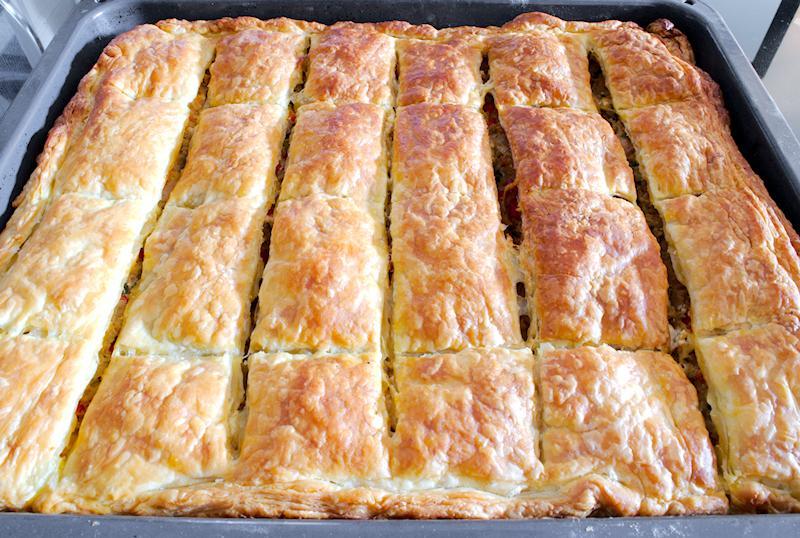 Όταν κρυώσει, προσθέτετε τα ελαφρώς χτυπημένα αυγά, τη θρυμματισμένη φέτα, το τριμμένο κίτρινο τυρί και ανακατεύετε καλά. Προθερμαίνετε το φούρνο στους 220 βαθμούς και λαδώνετε καλά, τη βάση και τα τοιχώματα ενός μεγάλου, ρηχού ταψιού. Στρώνετε στη βάση του ταψιού το ένα φύλλο σφολιάτας, το οποίο έχετε “ανοίξει” ελαφρώς με έναν πλάστη ώστε το μεγεθός του να καλύπτει τη βάση και τα τοιχώματα του ταψιού, όπως και έχει και ένα επιπλέον περιθώριο περιμετρικά για να το γυρίσετε αργότερα προς τα μέσα και να καλύψει τη γέμιση.