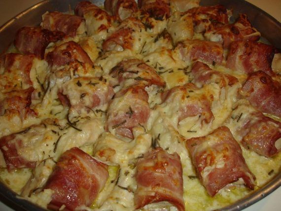 Εκτέλεση Κόβουμε τα φιλέτα κοτόπουλου σε μεγάλους κύβους και τους βάζουμε σε κατσαρόλα να βράσουν ελαφρά για 15 περίπου λεπτά, μαζί με το κρεμμύδι, το καρότο, τα φύλλα δάφνης, αλάτι και μία κουταλιά της σούπας ελαιόλαδο. Κατόπιν τα σουρώνουμε, τυλίγουμε κάθε κομμάτι με μία λωρίδα μπέικον και τα τοποθετούμε σε ταψί. Όταν τελειώσουμε με το τύλιγμα πασπαλίζουμε με τα τυριά, ρίχνουμε πιπέρι, το δεντρολίβανο και απλώνουμε την κρέμα γάλακτος να πάει παντού, βάζουμε τους κύβους βουτύρου σε διαφορετικά σημεία και ψήνουμε για 20 λεπτά σε κανονικό φούρνο.
