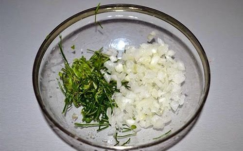 Ψιλοκόβουμε τα μυρωδικά και το κρεμμύδι και τα βάζουμε σε ένα μπολ