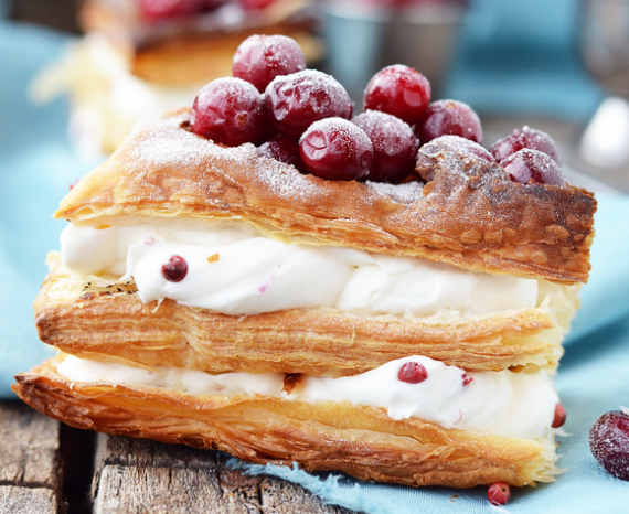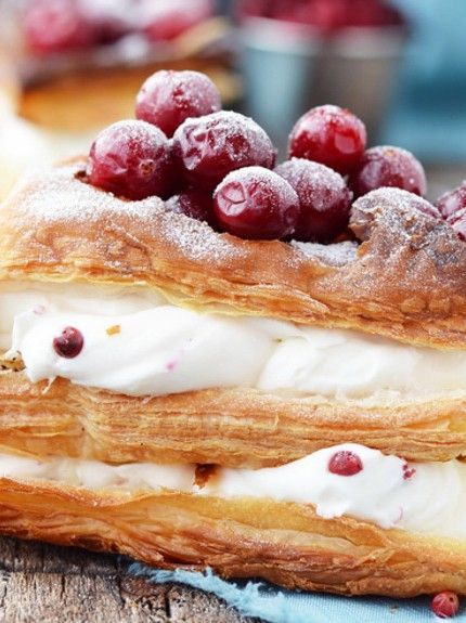 Το απόλυτο λευκό γλυκό, συνδυασμένο με τραγανά φύλλα σφολιάτας και βύσσινα.