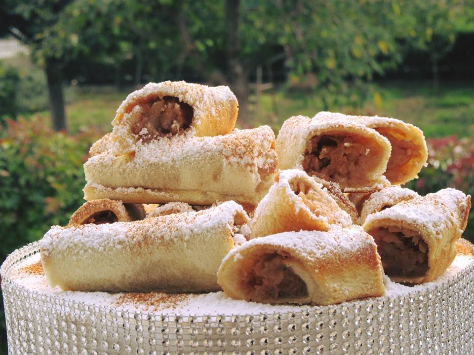 Τρίψτε τα μήλα από το χοντρό του τρίφτη μέσα σε τηγάνι. Προσθέστε την ζάχαρη την κανέλα και τα μπισκότα θρυμματισμένα στο μπλέντερ. Ανακατέψτε όλα μαζί για 3 λεπτά και αποσύρετε. Κόψτε την κόρα από το ψωμί και κάντε λεπτές φέτες με τον πλάστη σας . Βάζετε από μια κουταλιά σούπας από το μείγμα και τυλίγεται ρολακια. Σε τηγάνι λιώνετε βούτυρο και τηγανίζετε τα ρολάκια μέχρι να ροδίσουν σε χαμηλή φωτιά. Πασπαλίζετε με ζάχαρη άχνη και κανέλα.