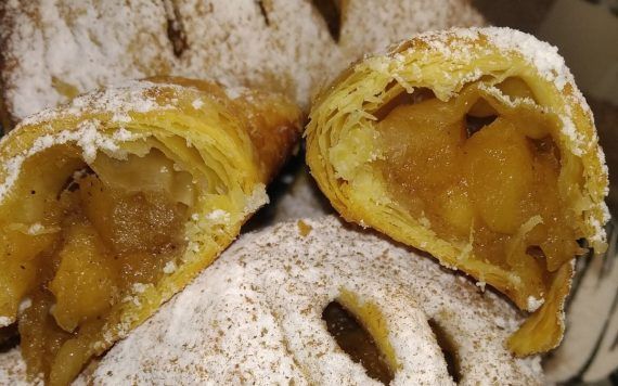 Με ένα κουταλάκι της σούπας βάζουμε σε κάθε κομμάτι από λίγη γέμιση και διπλώνουμε σε πιτάκι. Κάνουμε 2-3 χαρακιές στο πάνω μέρος, σε κάθε πιτάκι και ψήνουμε στους 180 βαθμούς Κελσίου μέχρι να ροδίσουν. Αφού γίνουν τα αφήνουμε να κρυώσουν και σερβίρουμε με ζάχαρη άχνη και κανέλα. Σας άρεσε αυτή η συνταγή; Όταν την φτιάξετε μοιραστείτε το αποτέλεσμα μαζί μας στα σχόλια.
