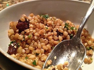 Εκτέλεση: Πλένουμε το σιτάρι από το προηγούμενο βράδυ και το βάζουμε να μουλιάσει με κρύο νερό και λίγο αλάτι σε μία κατσαρόλα. Το πρωί το ξεπλένουμε να φύγει η μαυρίλα του και το βράζουμε καλά για 40 λεπτά. Το στραγγίζουμε καλά στο σουρωτήρι και φυλάμε σε μπολ τον χυλό του. Το απλώνουμε σε πετσέτα και το αφήνουμε να στεγνώσει και όχι να ξεραθεί. Ξεπλένουμε τις σταφίδες και τις βουτάμε για 3 λεπτά σε ζεστό νερό για να μαλακώσουν. Τις σουρώνουμε και τις στεγνώνουμε σε πετσέτα.