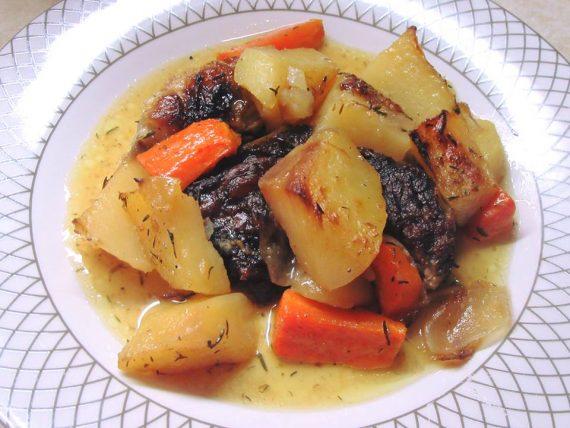 Έβρασα πρώτα το κρέας λίγο στην κατσαρόλα σε ταψί έκοψα τις πατάτες τα καρότα κ τα κρεμμύδια σε κομμάτια Έβαλα κ το κρέας και τα ανακάτεψα όλα μαζί με το σκόρδο λεμόνι μπαχαρικά κ το λάδι …τέλος έριχνα τον ζωμό από το κρέας αντί για νερό κ έψησα στους 180 μέχρι να γίνει το φαγητό..περίπου 2 ώρες κ κάτι.