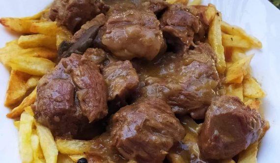 Μελωμένο μοσχαράκι κατσαρόλας με μία δεμένη σάλτσα λεμονιού συνοδευόμενο με τηγανιτές πατάτες.