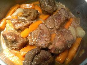 Προσθέτουμε τα καρότα ολόκληρα,το κρέας,τρίβουμε λίγο μοσχοκάρυδο και σβήνουμε με το κρασί Βράζουμε για λίγα λεπτά μέχρι να εξατμιστεί το αλκοόλ,αλατοπιπερώνουμε, ρίχνουμε 1 ποτήρι νερό και σιγοβράζουμε για περίπου 2 ώρες μέχρι να μαλακώσει το κρέας.Κατα την διάρκεια αν χρειαστεί προσθέτουμε νερό