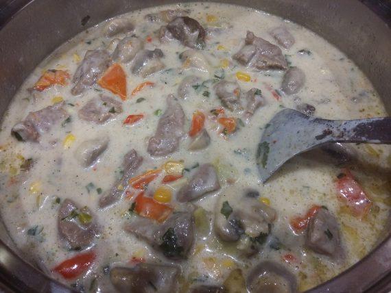 Κοβουμε σε μικρα κομματια το κρέας και αφου το σοτάρουμε ελαφρά στο ελαιόλαδο ,προσθέτουμε νερο και το αφηνουμε να βρασει. Σε μια αλλη κατσαρόλα βάζουμε ελαιόλαδο , το κρεμμύδι σε χοντρα φετακια ,τις πιπεριές και τα μανιτάρια. Μόλις μαραθούν ριχνουμε το κρεας και λιγο απο το ζωμο που εβρασε το κρεας και το καλαμπόκι. Μόλις παρει την πρώτη βράση προσθετουμε την κρεμα γάλακτος ,αλατι και πιπερι και το αφηνουμε να βρασει για 5 λεπτα . Τελος ριχνουμε τον μαιντανο , ανακατεβουμε και σβηνουμε το ματι .