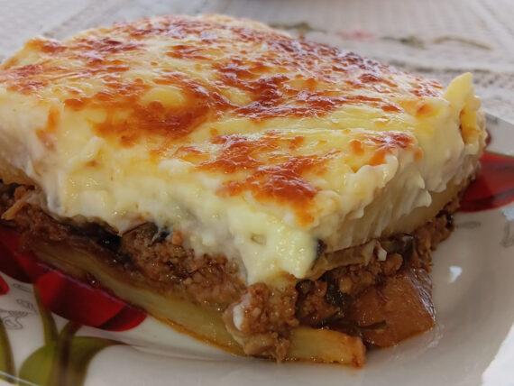 Συνταγή για μουσακά σαν της γιαγιάς με τρεμουλιαστή αφράτη μπεσαμέλ με κορν φλάουρ και το μυστικό για να μην τραβάνε λάδι οι μελιτζάνες και οι πατάτες από το τηγάνι.