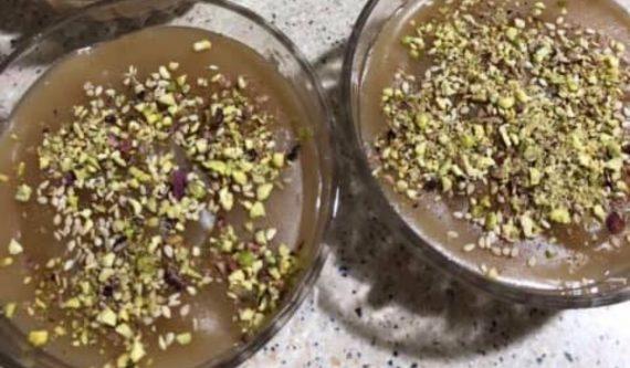 Μόλις το μείγμα αρχίζει να πήζει το κατεβάζουμε από την φωτιά και το μοιράζουμε σε μπολάκια. Πασπαλίζουμε το κάθε μπολ με φιστίκι Αιγίνης και σουσάμι. Προσθέτουμε και κανέλα και το βάζουμε στο ψυγείο. Μόλις πήξει, απολαμβάνουμε.
