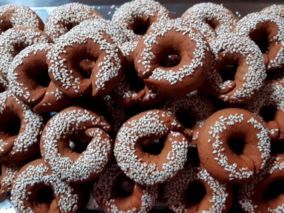 Ακολουθούμε την ίδια διαδικασία και με όλα τα υπόλοιπα μουστοκούλουρα με ή χωρίς σουσάμι. Τα μεταφέρουμε σε ένα ταψί με λαδόκολλα και τα τοποθετούμε με απόσταση μεταξύ τους γιατί φουσκώνουν. Τα ψήνουμε στους 170 βαθμούς Κελσίου, στις αντιστάσεις για 30 λεπτά.
