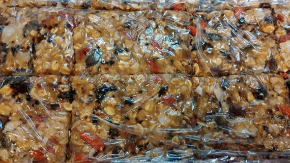 Ανακατεύουμε το ταχίνι με το μέλι. Ρίχνουμε τα κομμάτια σοκολάτας, τα τσιπς καρύδας και τα goji berries και ανακατεύουμε καλά. Στη συνέχεια, προσθέτουμε τα υπόλοιπα υλικά και συνεχίζουμε το ανακάτεμα μέχρι να ομογενοποιηθεί το μείγμα. Απλώνουμε το μείγμα σε ένα μεγάλο δίσκο καλυμμένο με μεμβράνη. Καλύπτουμε το μείγμα από πάνω με μεμβράνη και με ένα ρολάκι ισιώνουμε ώστε να γίνει ομοιόμορφο. Κόβουμε σε περίπου 30 τετράγωνα (ανάλογα με το μέγεθος του δίσκου) και τοποθετούμε στο ψυγείο όλο το βράδυ για να σφίξει – έχει καλύτερο αποτέλεσμα αν μείνει όλη τη νύχτα. Την επόμενη μέρα, χωρίζουμε τα τετραγωνάκια και τα τοποθετούμε σε σακουλάκι. Είναι έτοιμα για κέρασμα!