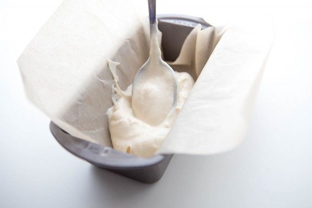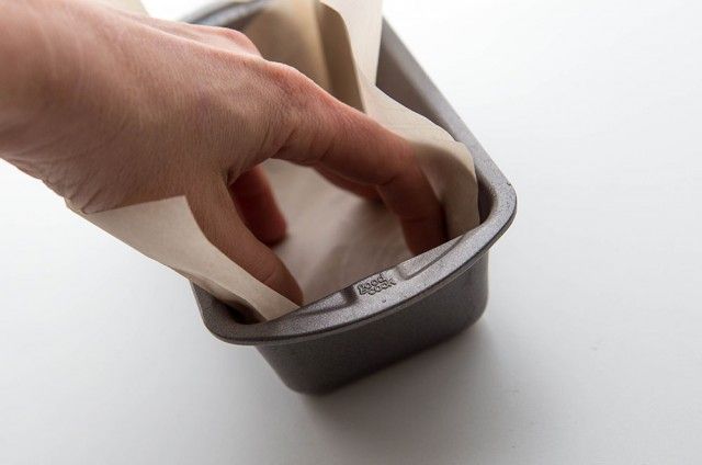 Στρώστε ένα κομμάτι λαδόκολλα σε μία μακρόστενη φόρμα του κέικ και βεβαιωθείτε ότι καλύπτει εντελώς τις μεγάλες πλευρές της φόρμας.