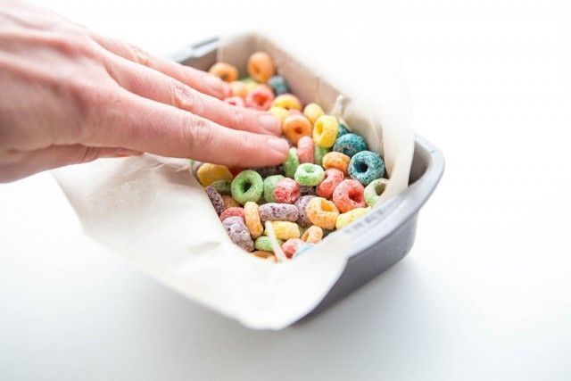 Πάνω από το μείγμα με το γιαούρτι απλώστε τα δημητριακά και πιέστε τα ώστε να δημιουργηθεί μία στρώση.