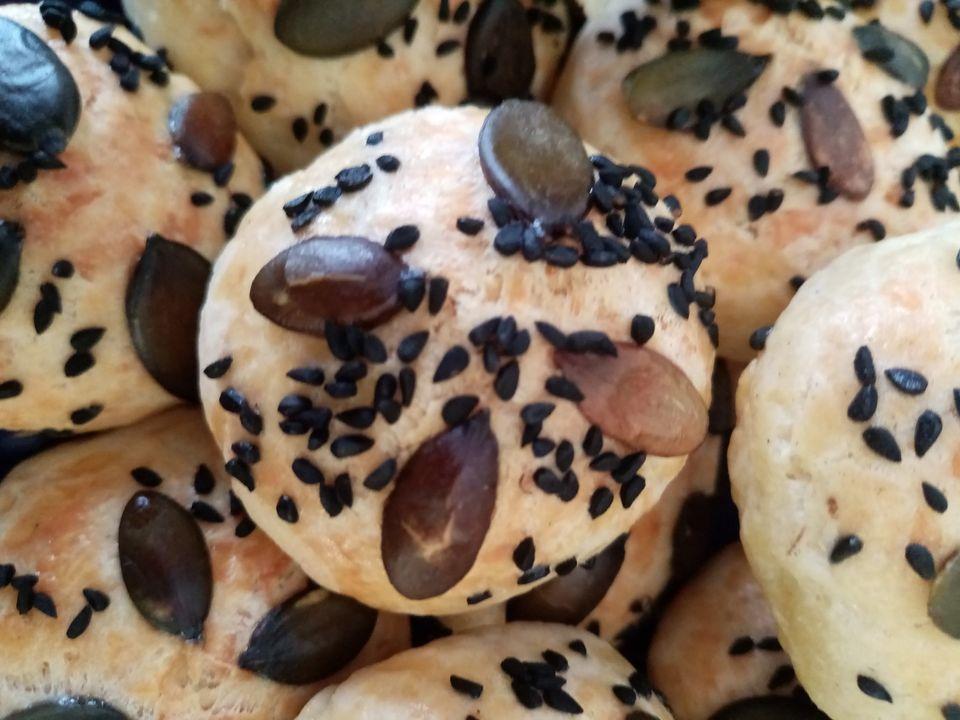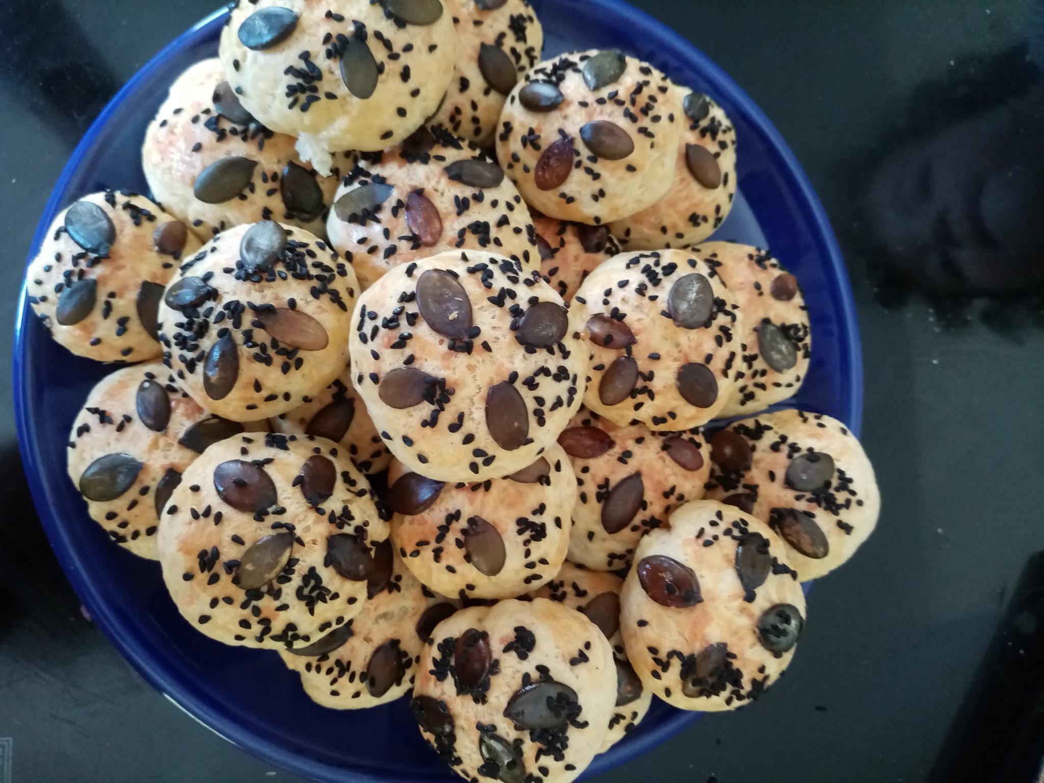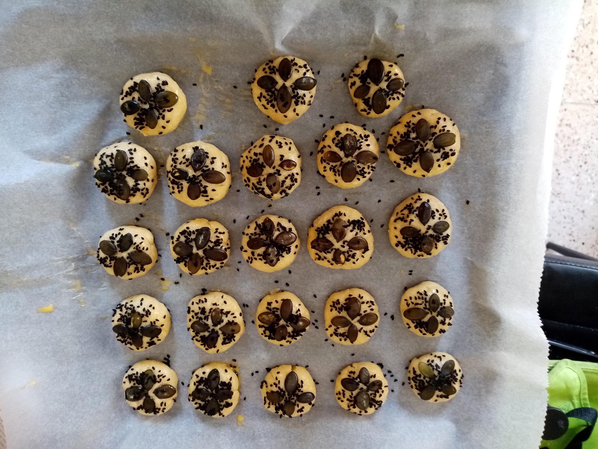 Τα γαρνίρουμε με κολοκυθόσπορο και μαύρο σουσάμι. Τα ψήνουμε στους 170 βαθμούς Κελσίου για 20 λεπτά. Η ποσότητα των υλικών αντιστοιχεί σε 23 μπισκότα.