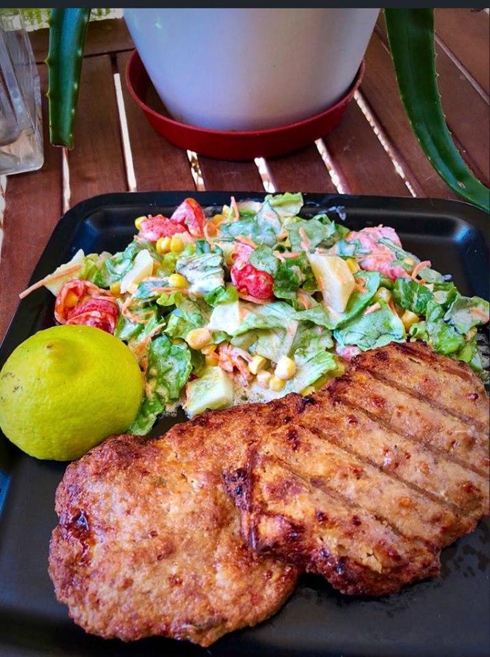 Σαλάτα Μαρούλι ρόκα ντοματίνια καλαμπόκι βρασμένο αγγουράκι είχα και 2 πατάτες βρασμένες και τις πρόσθεσα ψιλοκομμένες σε μπολ έβαλα αλατάκι και μία σωσ από μαγιονέζα λάδι μηλόξυδο χτυπημένα …επάνω από την σαλάτα και ανακάτεμα ! Καλή όρεξη !!!