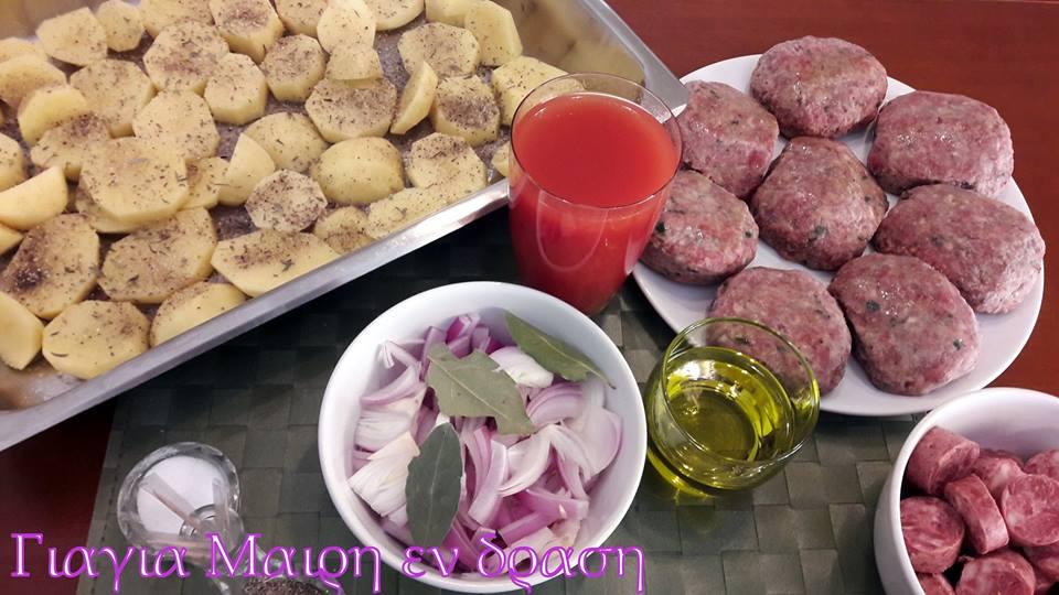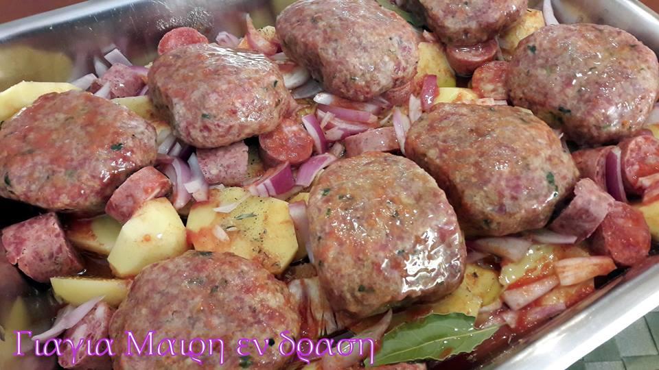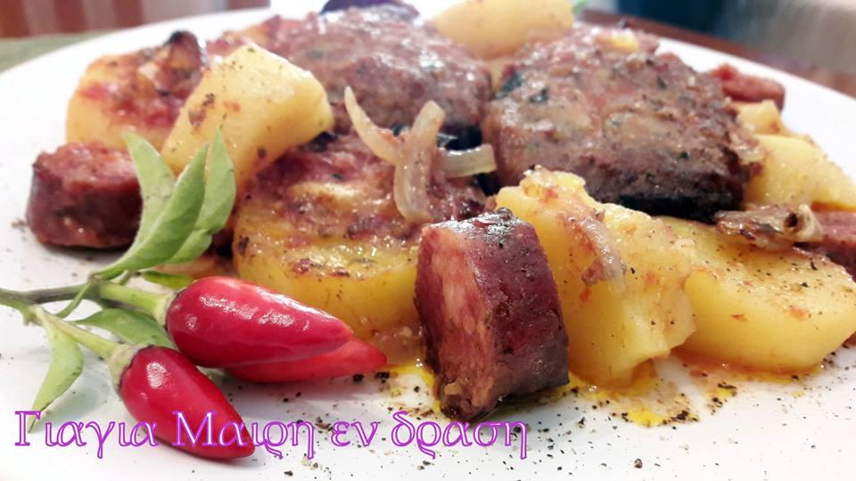 Μπιφτέκια με πατάτες και λουκάνικα Μάνης Σας έχει τύχει σίγουρα πολλές φορές να μην έχετε διάθεση να κάνετε ούτε βραστό αυγό. Σήμερα ένοιωθα έτσι ακριβώς. Είπα θα κάνω κάτι γρήγορο και πρόχειρο. Άνοιξα τον καταψύκτη μου και είχα έτοιμα ζυμωμένα μπιφτέκια και υπέροχο μοσχοβολιστό λουκανικάκι Μάνης. Τα πάντρεψα με πατατούλες και ντοματοχυμό και ιδού το αποτέλεσμα.