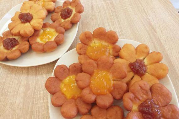Τοποθετούμε σε μια πιατέλα χαρτί κουζίνας. Στην συνέχεια βάζουμε στο κέντρο του λουλουδιού λίγη μαρμελάδα της αρεσκείας μας. Αν θέλουμε μπορούμε να τα πασπαλίσουμε και με λίγη ζάχαρη άχνη.