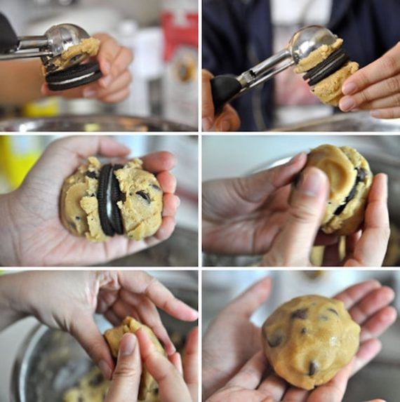 Παίρνετε με το κουτάλι δύο περίπου ίδιες ποσότητες ζύμης, βάζετε τη μία πάνω και την άλλη κάτω από το oreo και πιέζετε μέχρι να έχετε μια μπάλα.