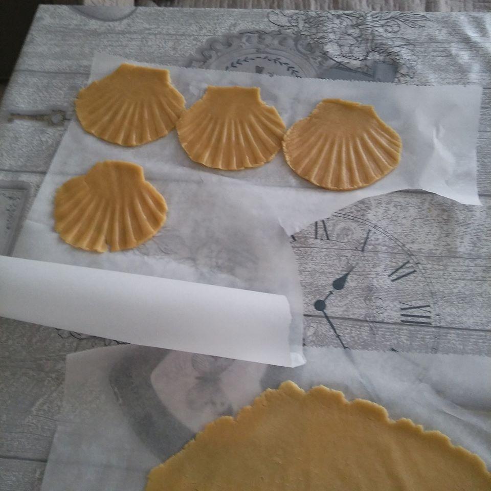 Παίρνουμε μια φόρμα σε σχήμα κοχυλιού και την κολλάμε πάνω στην ζύμη. Στη συνεχεία την αφαιρούμε προσεχτικά. Βάζουμε τα μπισκότα μας να ψηθούν σε ένα ταψί με λαδόκολλα.