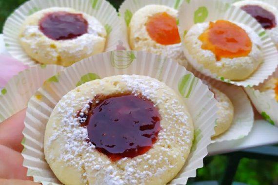 Μπορούμε αν θέλουμε να μην προσθέσουμε την μαρμελάδα. Να τα αφήσουμε κενά, να τα ψήσουμε και στην συνέχεια να βάλουμε ό,τι θέλουμε. Στην συνέχεια, πασπαλίζουμε τα μπισκότα μας άψητα με ζάχαρη άχνη.